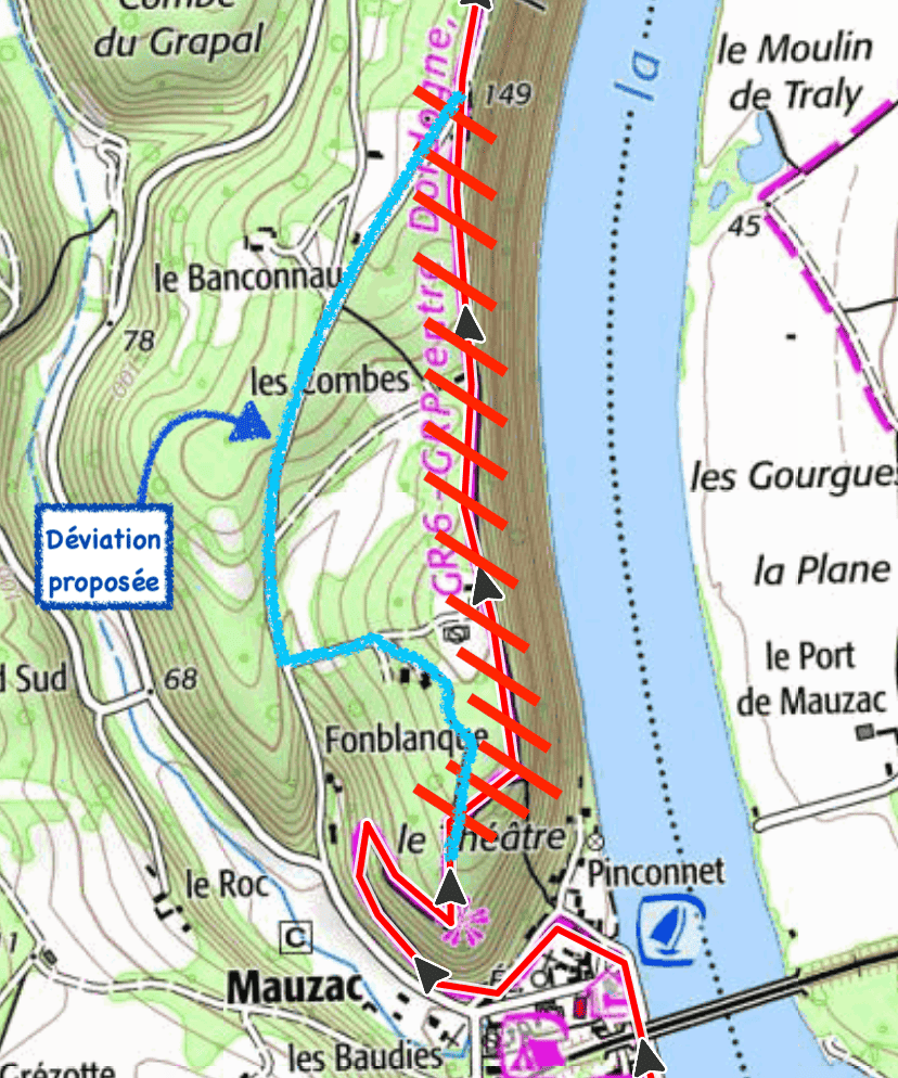 Le début de la remontée vers Limeuil est possible mais la partie surplombant la Dordogne est fermée pour quelques mois. Veuillez suivre la déviation proposée par la mairie. Merci aux baliseurs officiels du club des Marcheurs de la Vallée (Lalinde) pour leur travail.